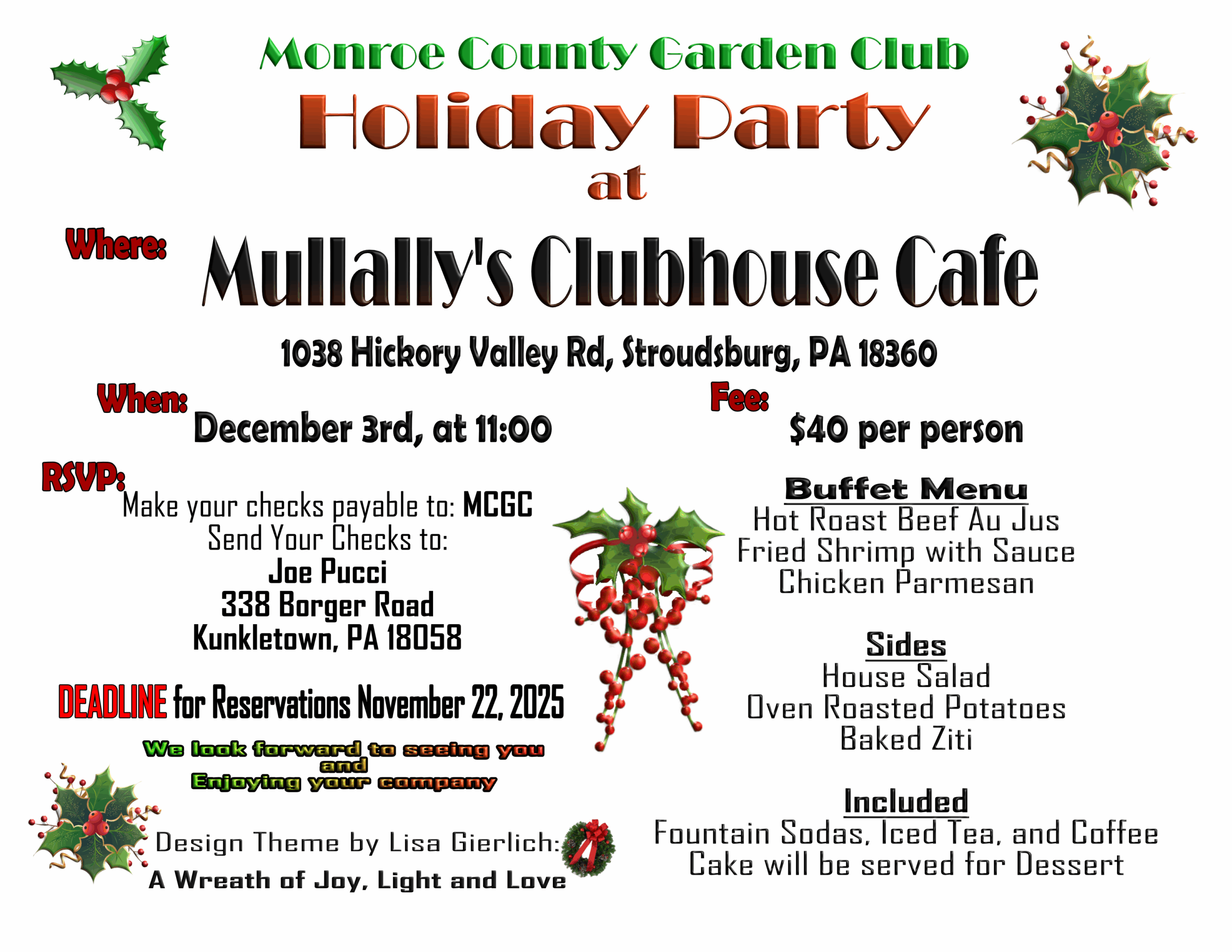 Club members are invited to our annual holiday party on December 3rd at 11:00 at Mullally’s Clubhouse Cafe, 1038 Hickory Valley Rd, Stroudsburg, PA 18360.