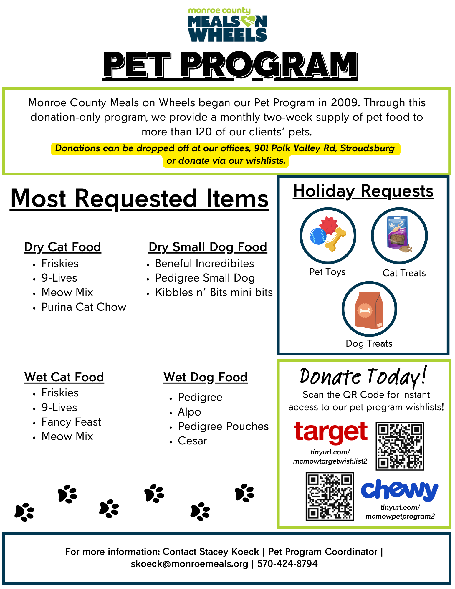 We are collecting donations for the Meals on Wheels Pet Program. If you bring your pet food donations to the meeting, we’ll make sure they get it. For more details about the program or how to participate, please refer to the flyer by clicking here.